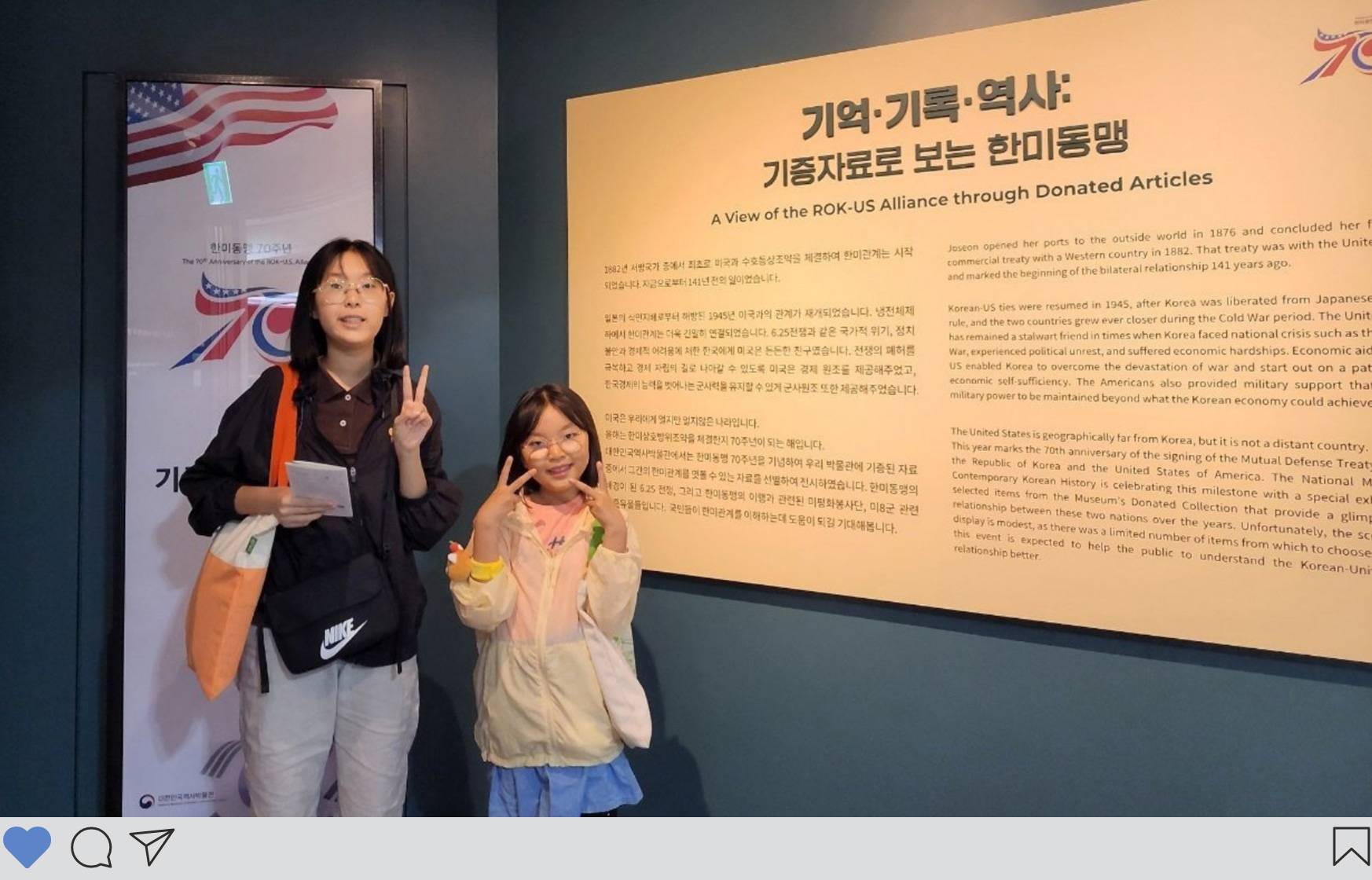 추석 연휴에 가족과 함께 서울 나들이를 해 대한민국역사박물관에 들렀습니다. 한미동맹 70주년 기념 특별전 <동행>을 함께 봤어요. 그동안 몰랐던 동맹의 의미를 알게 됐죠. 가장 인상 깊었던 것은 미국의 바이든 대통령과 한국의 윤석열 대통령의 만남이 담긴 사진입니다. 한미동맹의 의지를 굳건히 보여주는 전시물이라 느꼈어요. 뉴스에서나 보던 두 나라 정상의 만남 장면을 기념하고 싶어서 열심히 사진을 찍어두었어요.